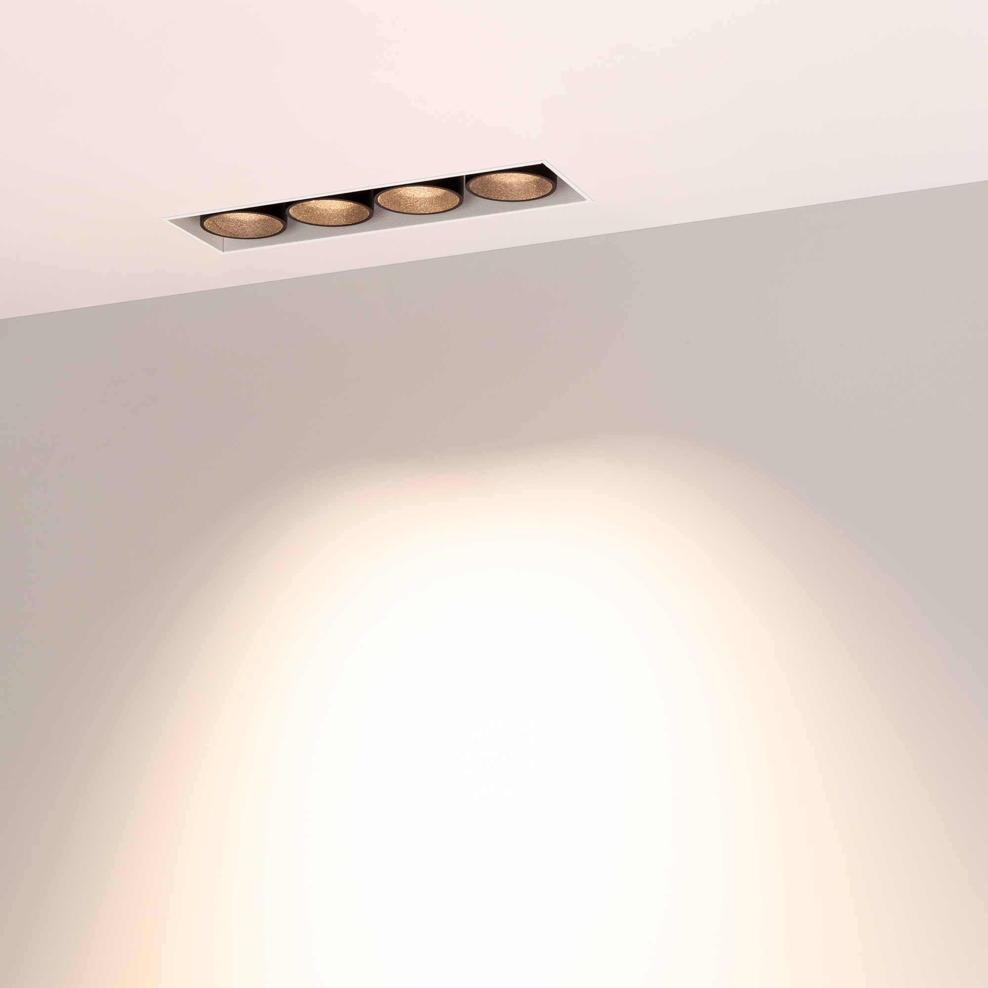 Встраиваемый безрамочный светильник под шпаклевку. Мощность 10 Вт, св. поток 750 лм, 75 лм/Вт, теплый 3000 K, CRI>98, угол 30°, напряжение питания 230 В. Белый прямоугольный корпус из алюминия, экран PMMA, степень защиты IP20. Размер: длина 127 мм, ширина 38 мм (с фланцем 80 мм), высота 53 мм. Монтаж встраиваемый, установочное отверстие длина 130 мм, ширина 50 мм. Драйвер 9-14 В, 700 мА, пульсация <1%.
