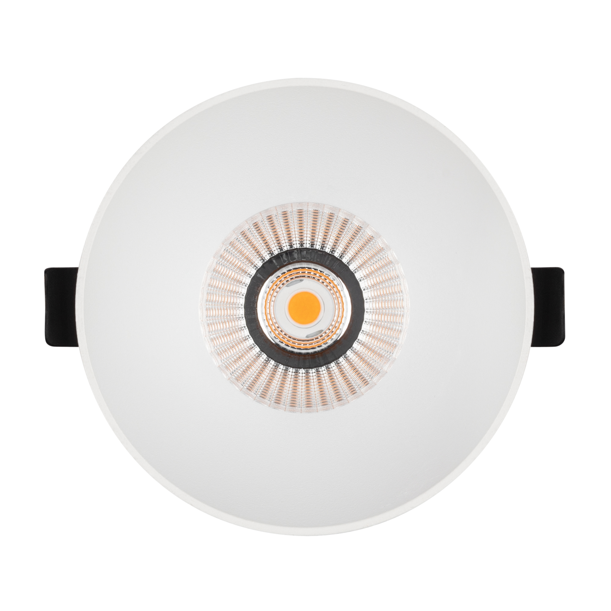Встраиваемый светильник даунлайт. Мощность 10 Вт, св. поток 875 лм, 88 лм/Вт, теплый 3000 K, CRI>90, UGR<16, угол 38°, напряжение питания 230 В. Белый круглый корпус из алюминия, степень защиты IP20. Размер: диаметр 82 мм, высота 76 мм. Монтаж встраиваемый, установочное отверстие: диаметр 76 мм. Драйвер 20-40 В, 250 мА, пульсация <2%.
