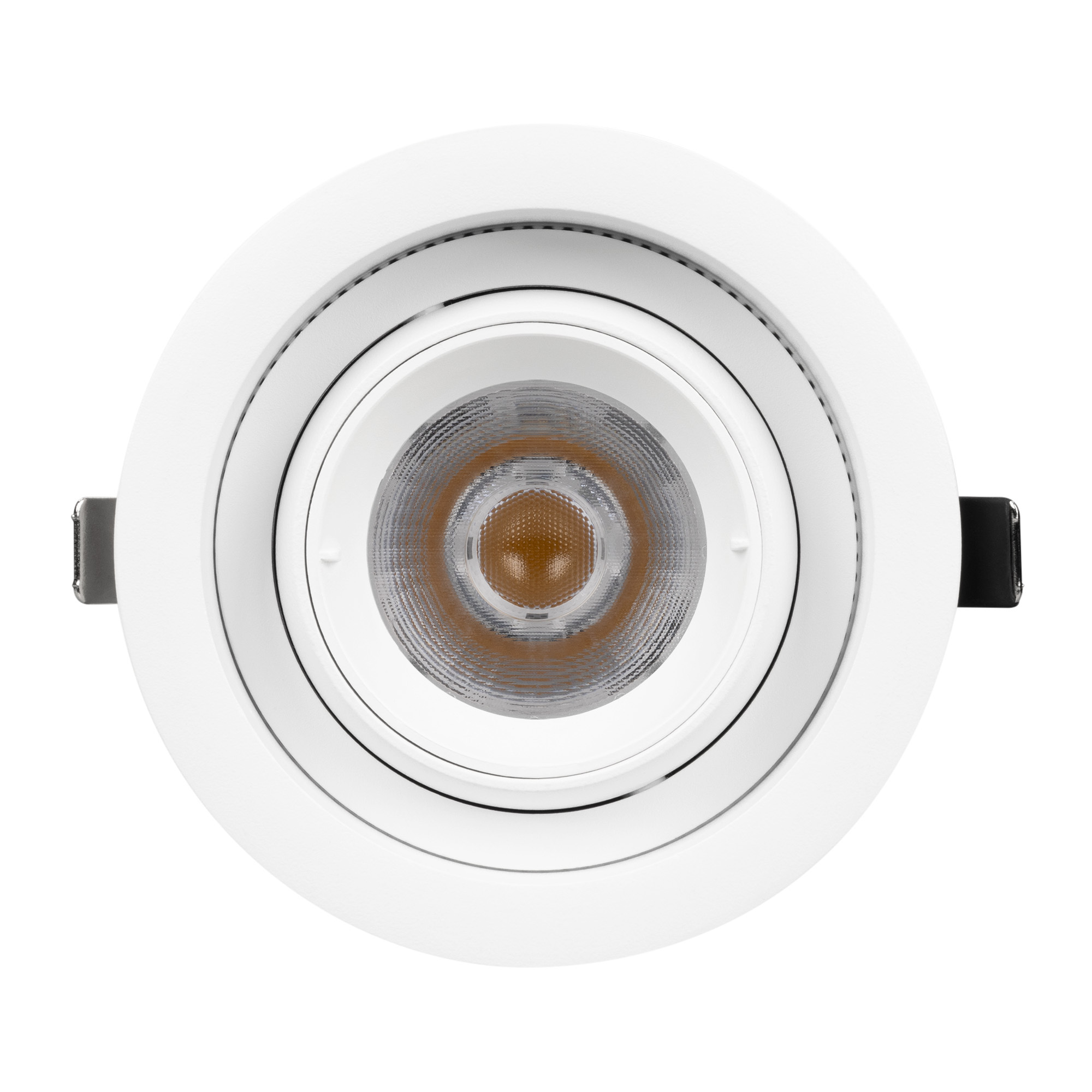Встраиваемый карданный светильник. Мощность 20 Вт, св. поток 2132 лм, 107 лм/Вт, дневной 4000 K, CRI>92, угол 40°, напряжение питания 230 В. Белый корпус из алюминия, белая вставка, степень защиты IP20. Размер: диаметр 110 мм, высота 105 мм. Монтаж встраиваемый, установочное отверстие: диаметр 95 мм. Драйвер 24-42 В, 500 мА, пульсация <2%.