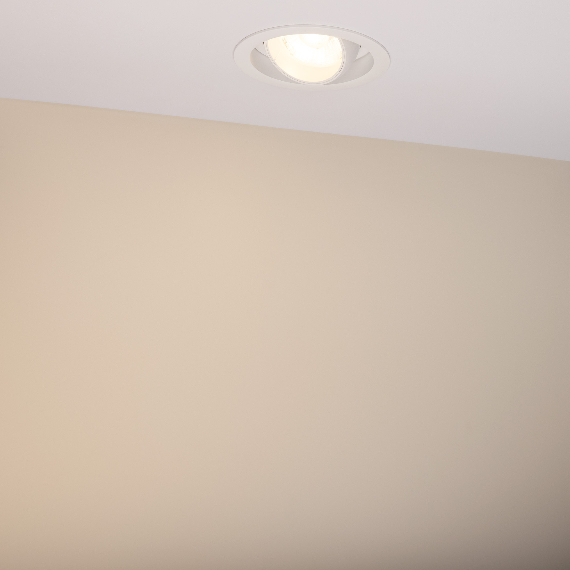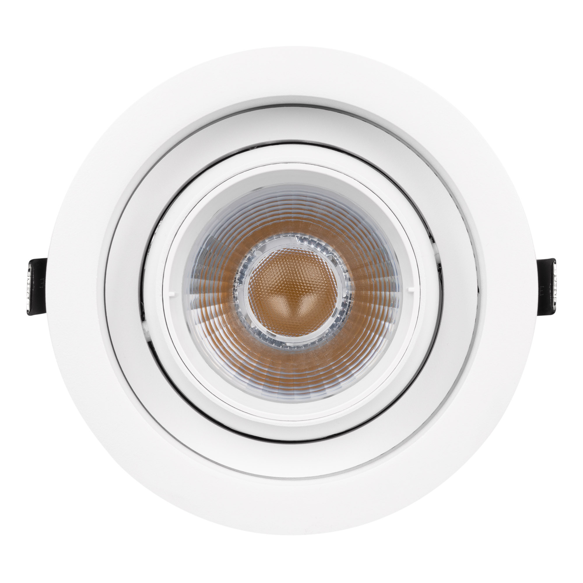 Встраиваемый карданный светильник. Мощность 30 Вт, св. поток 3260 лм, 106 лм/Вт, тёплый 3000 K, CRI>92, угол 30°, напряжение питания 230 В. Белый корпус из алюминия, белая вставка, степень защиты IP20. Размер: диаметр 135 мм, высота 125 мм. Монтаж встраиваемый, установочное отверстие: диаметр 120 мм. Драйвер 24-42 В, 750 мА, пульсация <2%.