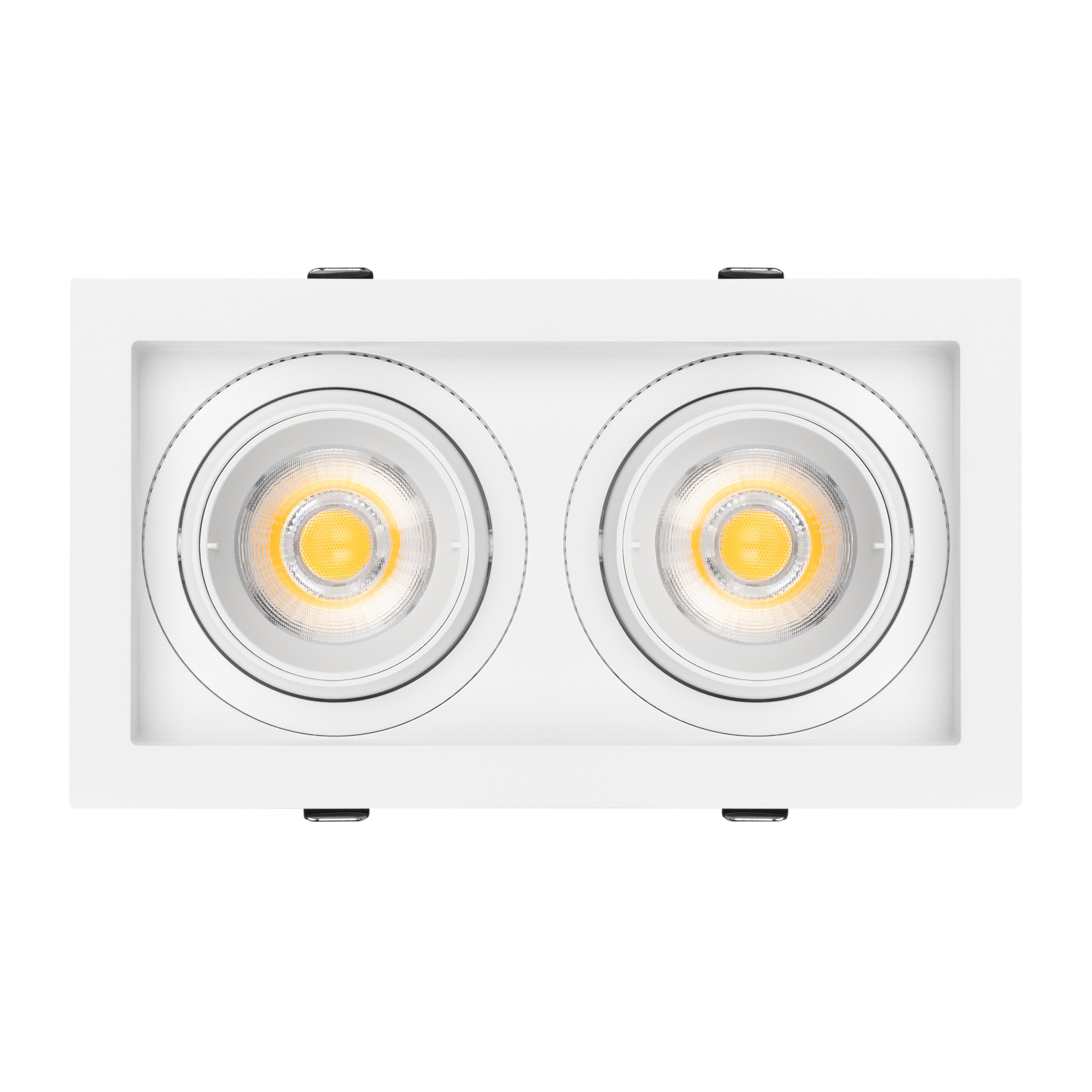 Встраиваемый карданный светильник. Мощность 2х20 Вт, св. поток 4264 лм, 106 лм/Вт, дневной 3000 K, CRI>92, угол 40°, напряжение питания 230 В. Белый корпус из алюминия, черная вставка, степень защиты IP20. Размер: длина 210 мм, ширина 117 мм, высота 105 мм. Монтаж встраиваемый, установочное отверстие: длина 190 мм, ширина 95 мм. Драйвер 24-42 В, 500 мА, пульсация <2%.