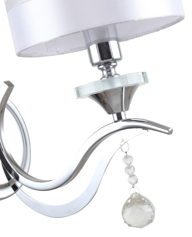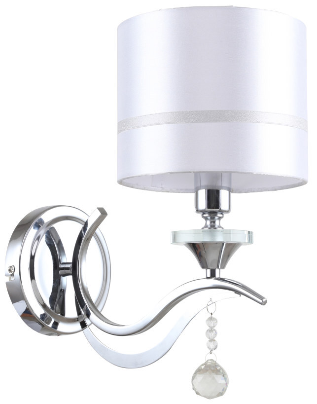 Светильник настенный из коллекции Flippe выполнен из металла, гальванизированного в цвет хрома. Бра декорировано прозрачным хрусталем в форме шара и декоративной розеткой из прозрачного стекла. Источник света закрыт белым текстильным абажуром с термостойким акрилом внутри. Абажур отделан серым кантом.
