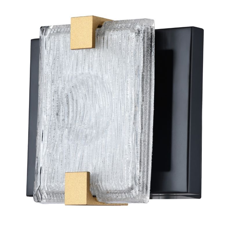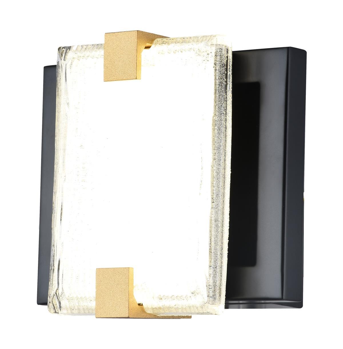 Светильник настенный из коллекции Crown выполнен из металла, окрашенного в черный цвет. Матовый плафон из фактурного стекла закреплен держателями, окрашенными в цвет золота.