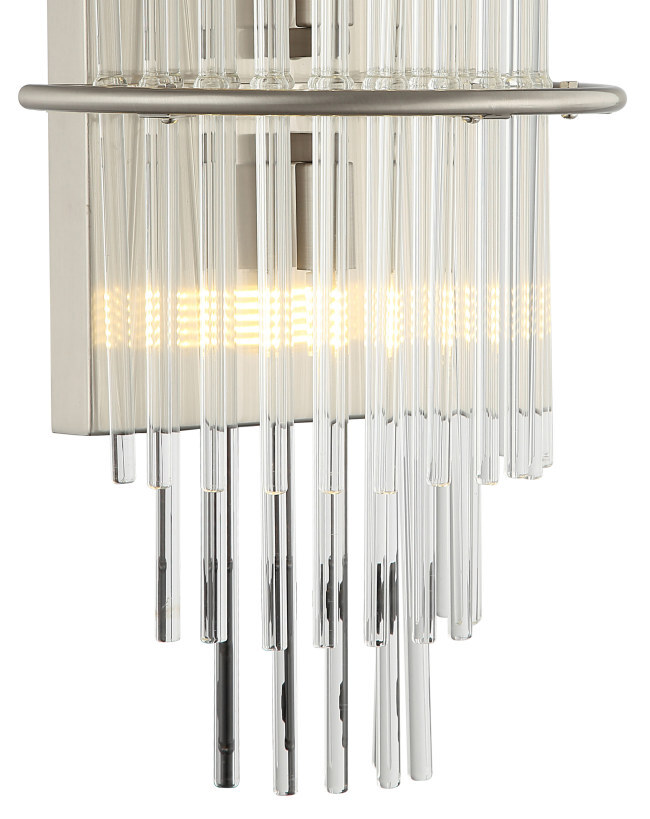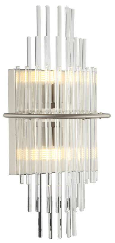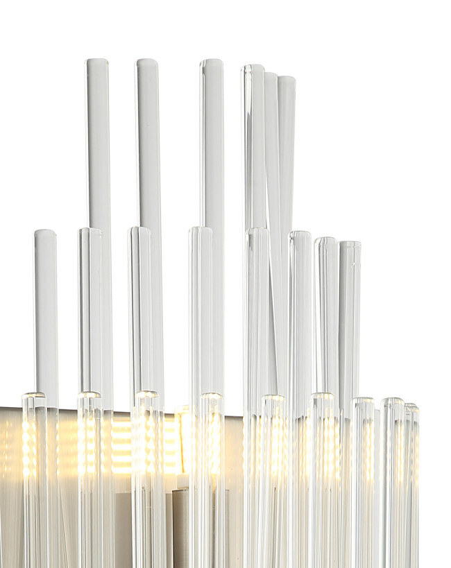 Светильник настенный из коллекции Eclipse выполнен из металла, гальванизированного в цвет никеля, и декорирована стеклянными трубочками, установленными на прозрачный акрил. Декор окружён кантом из металла, гальванизированного в цвет арматуры. Современная форма и высокое качество светильников идеально подойдут как в классические, так и современные интерьеры.