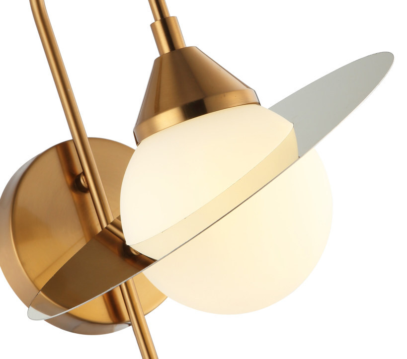 Светильник настенный из коллекции Saturn выполнен из металла, гальванизированного в цвет бронзы, и декорирован круглым белым матовым плафоном. Для декора плафона используется пластина из нержавеющей стали, отполированная до зеркального блеска, и напоминающая орбиту Сатурна. Пластина лежит свободно, благодаря чему может менять направление отражения глянцевых дисков. Премиальное качество и неповторимыи? дизаи?н светильников идеально подои?дут в современные и дизайнерские интерьеры.