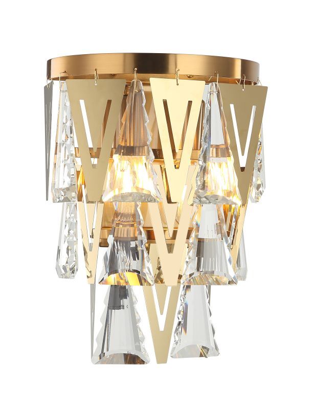 Светильник настенный из коллекции Vaviani выполнен из металла, гальванизированного в цвет бронзы, и декорирован прозрачным хрусталем высшей категории треугольной формы и тонкими треугольниками из нержавеющей стали, отполированной до зеркального блеска и гальванизированной в цвет арматуры. Светильник настенный коллекции выглядит стильно и респектабельно. Премиальное качество и неповторимыи? дизаи?н светильников идеально подои?дут как в классические, так и современные дизайнерские интерьеры.