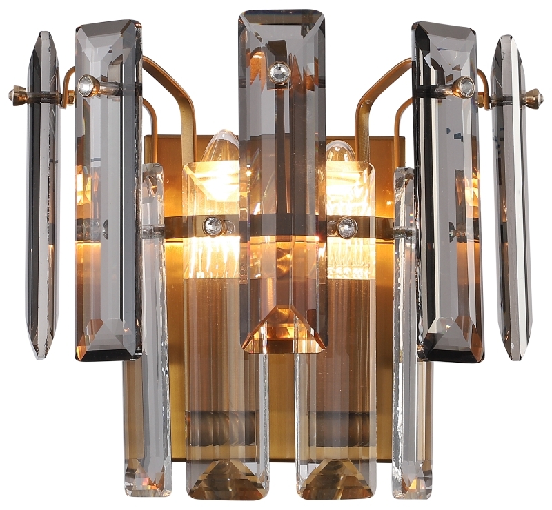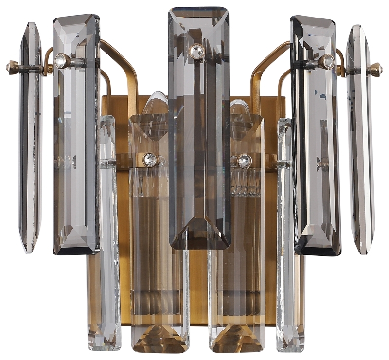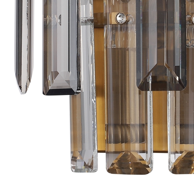 Светильник настенный из коллекции Ton выполнен из металла, гальванизированного в цвет бронзы, и декорирован прозрачным и дымчатым хрусталем высшей категории прямоугольной формы. Светильник выглядит респектабельно и современно.