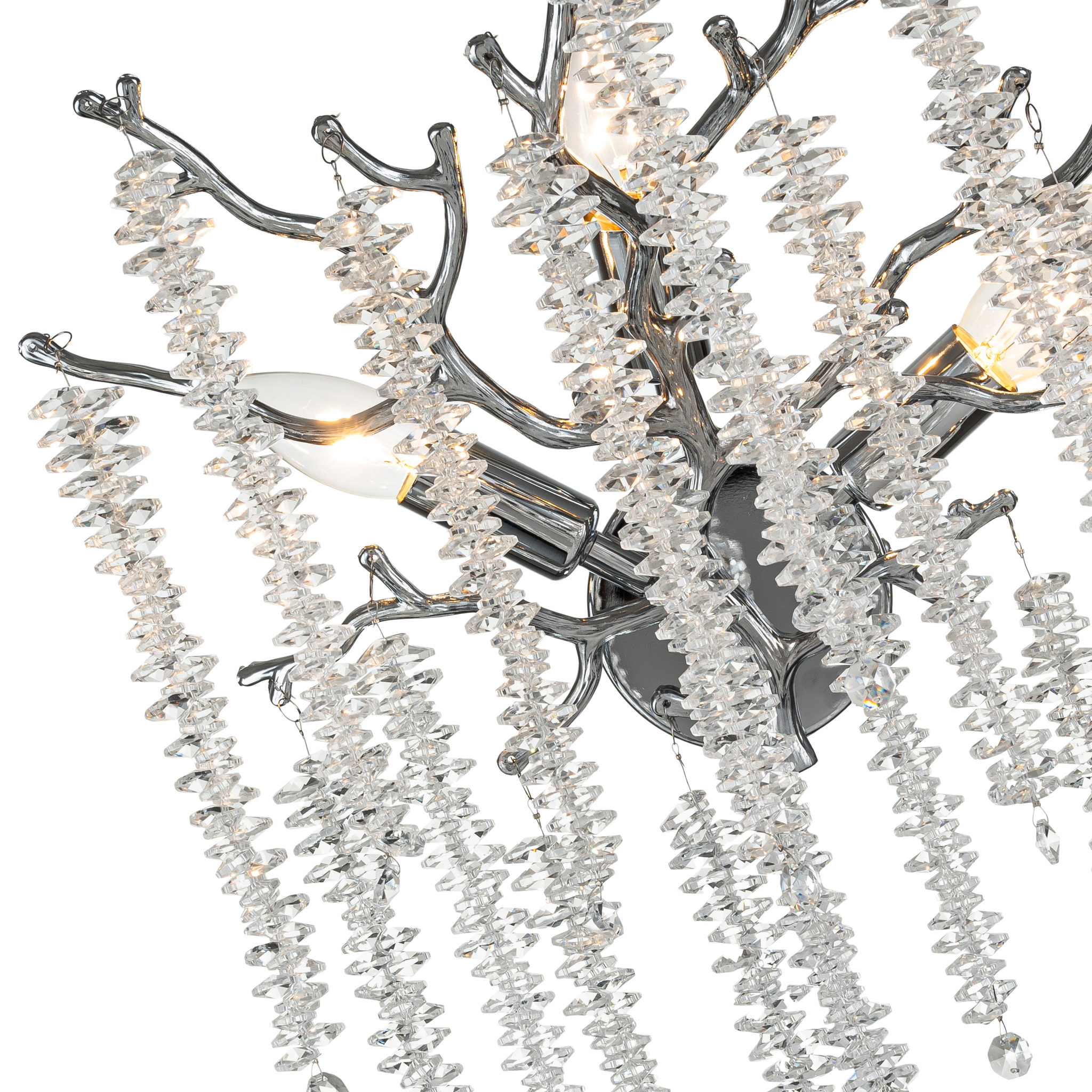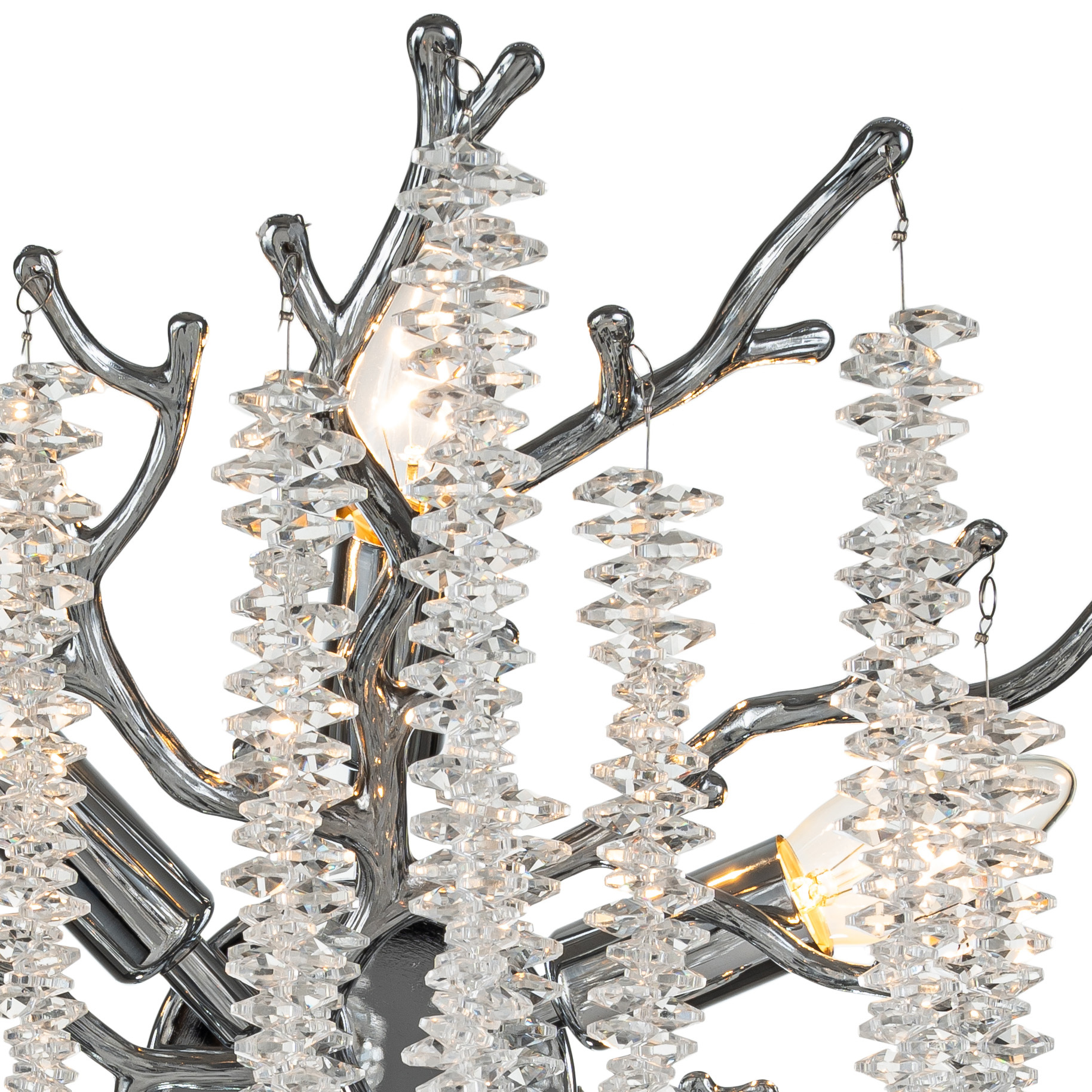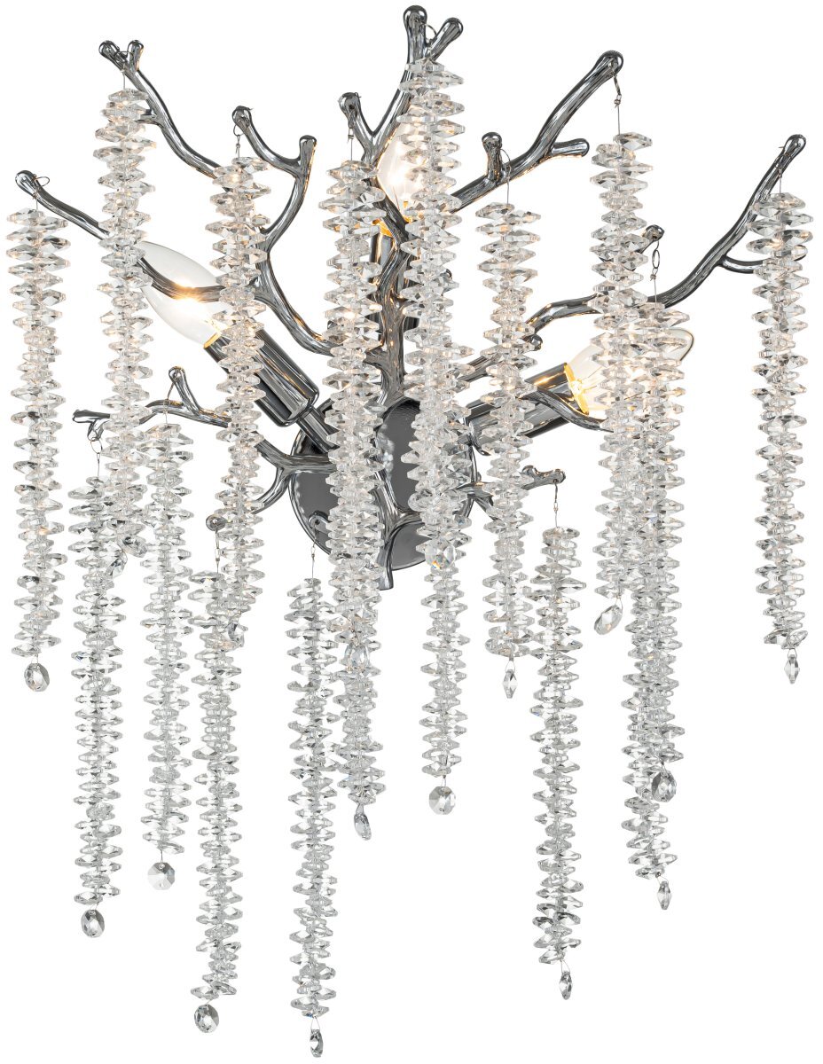Светильник настенный коллекции EIVA выполнен из сплава алюминия, гальванизирован в цвет хрома и декорирован гроздьями из хрусталя в форме октагон. Светильники коллекции отличает повышенное содержание хрусталя (18 хрустальных гроздьев) и лампы с цоколем Е14. Из данной коллекции светильников можно сделать индивидуальный заказ любого цвета и размера.