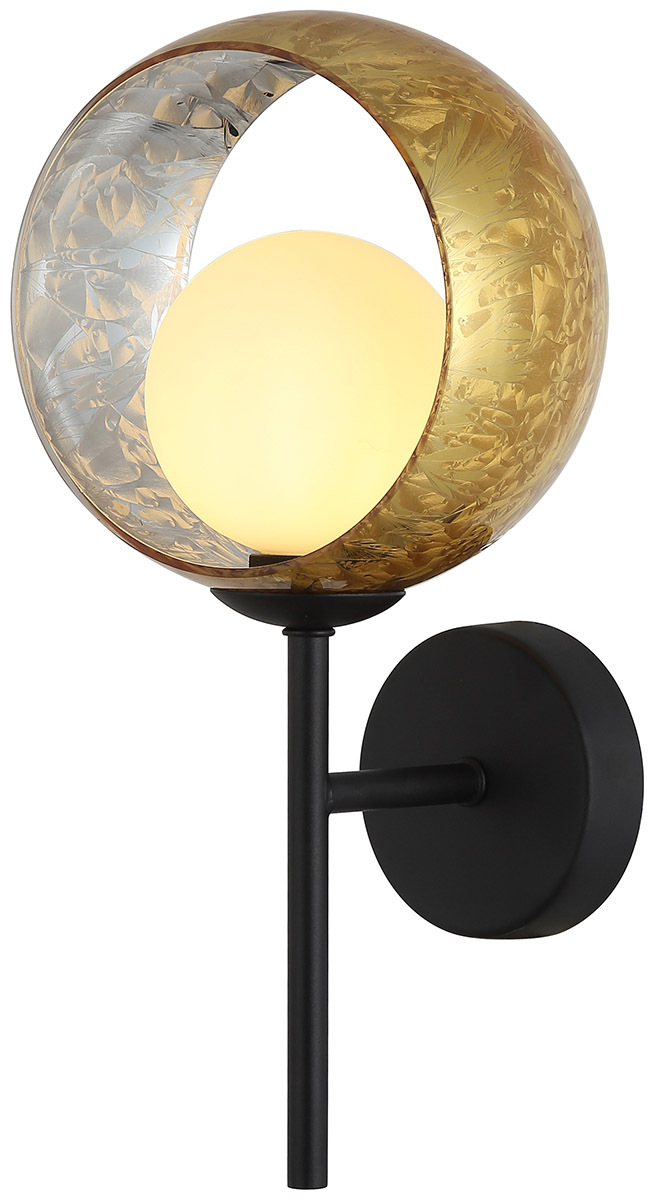 Светильник настенный коллекциии RAUNDI выполнен из металла, окрашенного в черный цвет, и декорирован двумя стеклянными плафонами . Белый матовый плафон из стекла в форме сферы и декоративный стеклянный плафон в виде кольца окрашен в золотистый цвет. Индивидуальный рисунок ручной работы, имитирующий узоры инея, придаёт коллекции эксклюзивность. Премиальное качество и неповторимыи? дизаи?н светильников идеально подои?дут в современные и дизайнерские интерьеры.