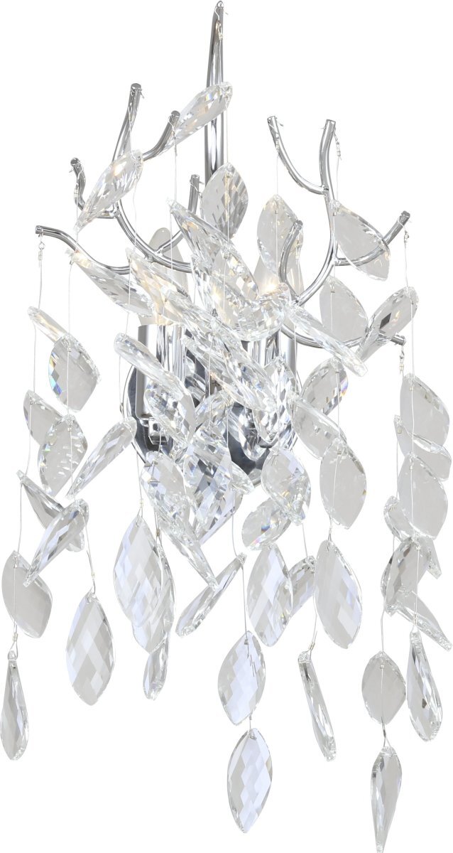 Светильник настенный коллекции RAMO выполнен из металла, гальванизированного в цвет хрома, и декорирован гроздьями из хрусталя винтажной формы. Отличительной особенностью данной коллекции является ручное изготовление каркаса с дополнительной полировкой стыков арматуры и увеличенным количеством хрустальных подвесок (12 веточек по 5 кристаллов).