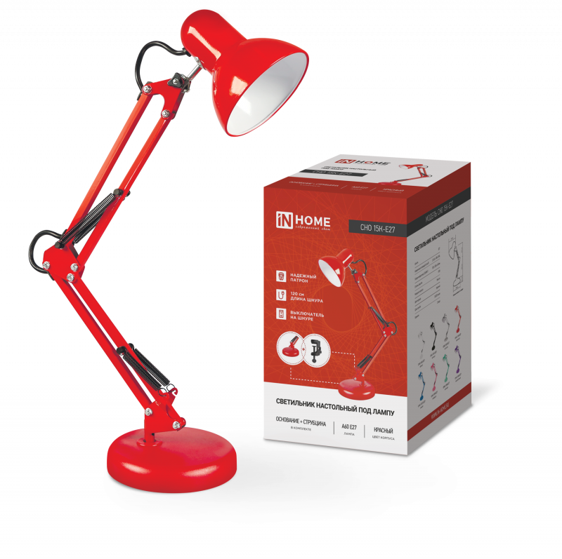 Серия настольных светильников СНО-15 от ТМ INhome предназначена для локального освещения рабочего стола. Устойчивое основание, компактные размеры, широкий угол освещения, регулируемая по высоте и положению шарнирная конструкция делают светильник СНО-15 идеальным выбором для дополнительного освещения рабочей зоны. Линейка представлена в широком разнообразии цветов: белый, черный, серебро, красный, синий, розовый, мятный и фиолетовый. Яркий и стильный настольный светильник украсит любой современный интерьер. Светильник представлен с мощностью 60Вт с цоколем Е27.