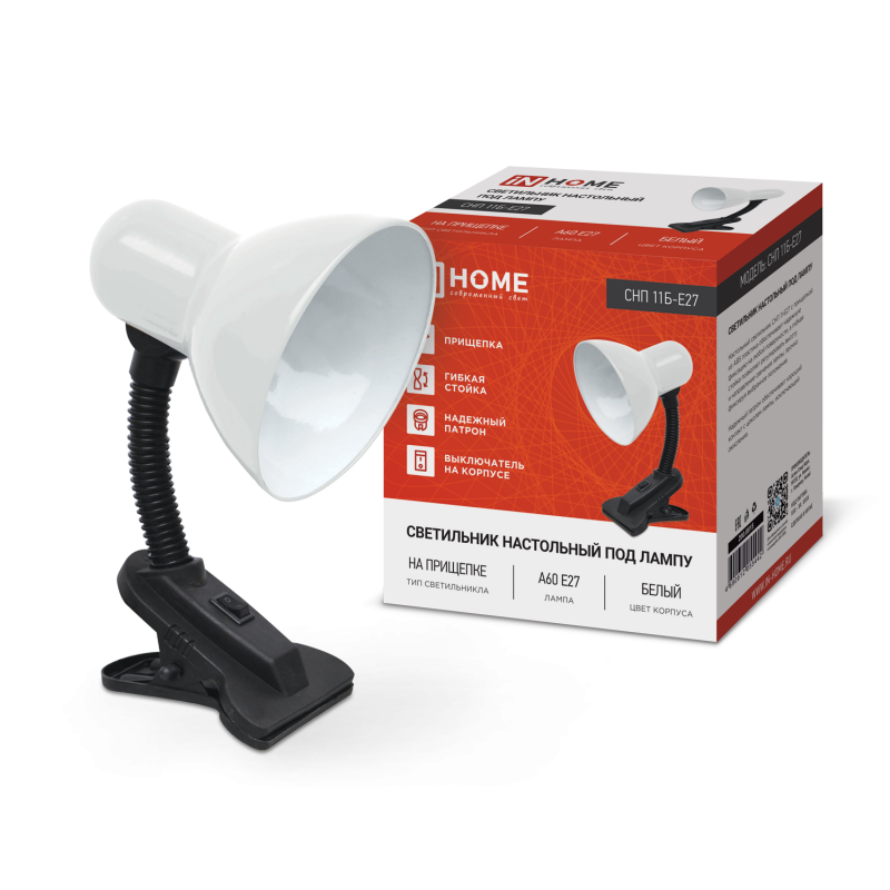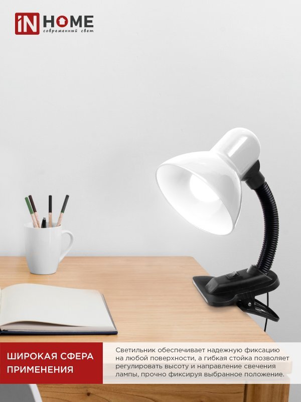 Светильник настольный СНП 11Б-E27 под лампу на прищепке бел. (кор.) IN HOME 4690612055442
