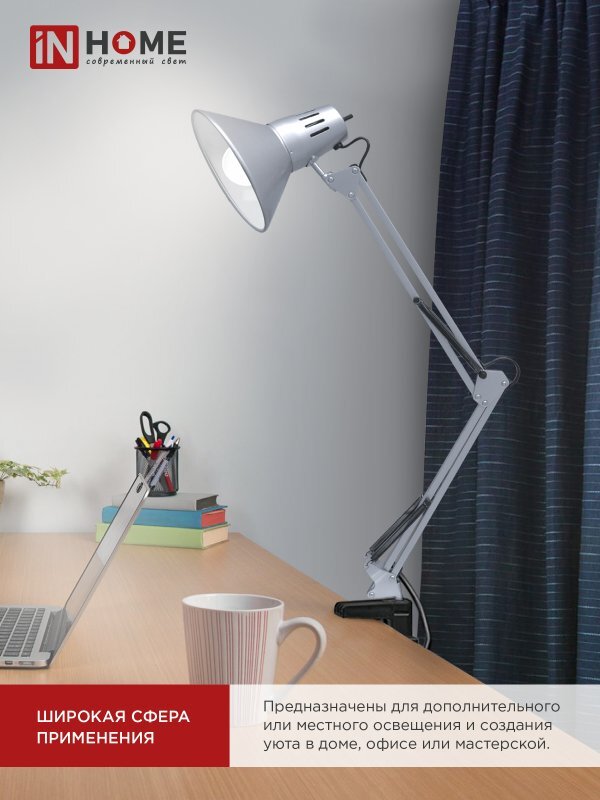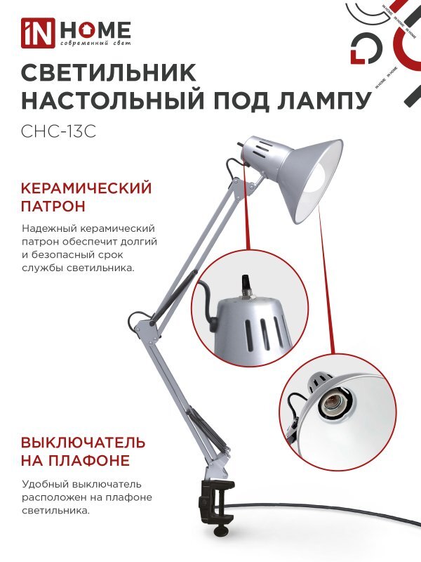 Светильник настольный СНС 13С 60Вт E27 230В под лампу на струбцине серебр. (кор.) IN HOME 4690612012889