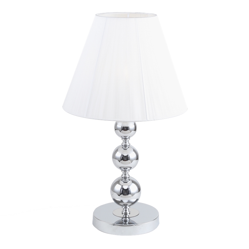 Светильник настольный из коллекции Nifty выполнен из металла, гальванизированного в цвет хрома. Текстильный абажур белого цвета создает мягкий рассеянный свет. Светильник декорирован металлическими сферами, гальванизированными в цвет арматуры.