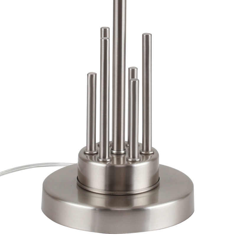Светильник настольный из коллекции Chart выполнен из металла, гальванизированного в цвет никеля, и декорирована железными стержнями в цвет арматуры. Текстильный абажур белого цвета с термостойким акрилом внутри отделан кантом в цвет арматуры. Декоративная розетка выполнена из прозрачного стекла.