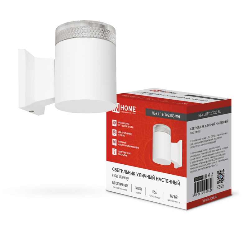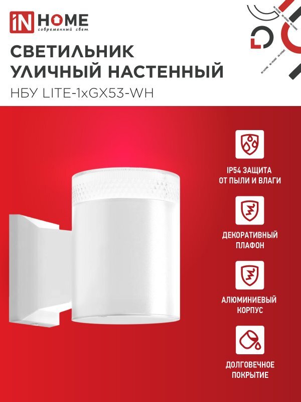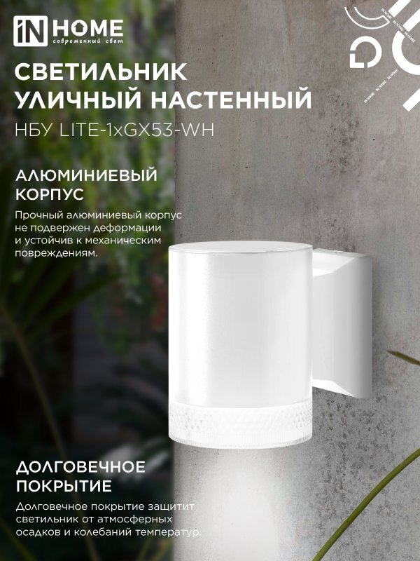 Светильник НБУ LITE-1хGX53-WH IP65 уличный настен. односторон. под лампу 1хGX53 алюм. бел. IN HOME 4690612051826