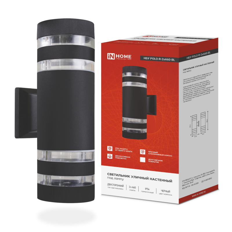 Светильник НБУ POLO-R-2хA60-BL E27 IP65 230В уличный настен. двусторон. под лампу 2хA60 алюм. черн. IN HOME 4690612037943