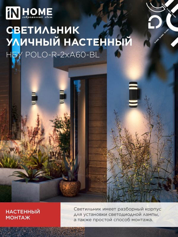 Оригинальные уличные светильники POLO-R-2xA60-BL от ТМ In Home предназначены для работы со светодиодными лампами E27. Линейка представлена в черном цвете и двух вариантах исполнения (круглый и квадратный корпус). Светильники предназначены для фасадной подсветки загородных домов, коттеджей, ресторанов, инсталляций. Благодаря современному дизайну, лаконичной форме и нестандартному световому эффекту, они станут идеальным решением для акцентного освещения общественных зданий и частных загородных коттеджей. Светильник имеет разборный корпус для установки светодиодной лампы. Корпус защищен специальной прокладкой, которая предотвращает проникновение влаги и защищает от запотевания. Основные характеристики светильника: • Предназначен под лампы E27 • Рассеиватель – стекло • Форма корпуса – цилиндр • Форматы светильников – односторонний и двухсторонний • Цвета корпуса – черный • Температурный диапазон -20° +40°C • Степень защиты IP65 • Простой монтаж и установка