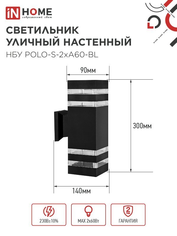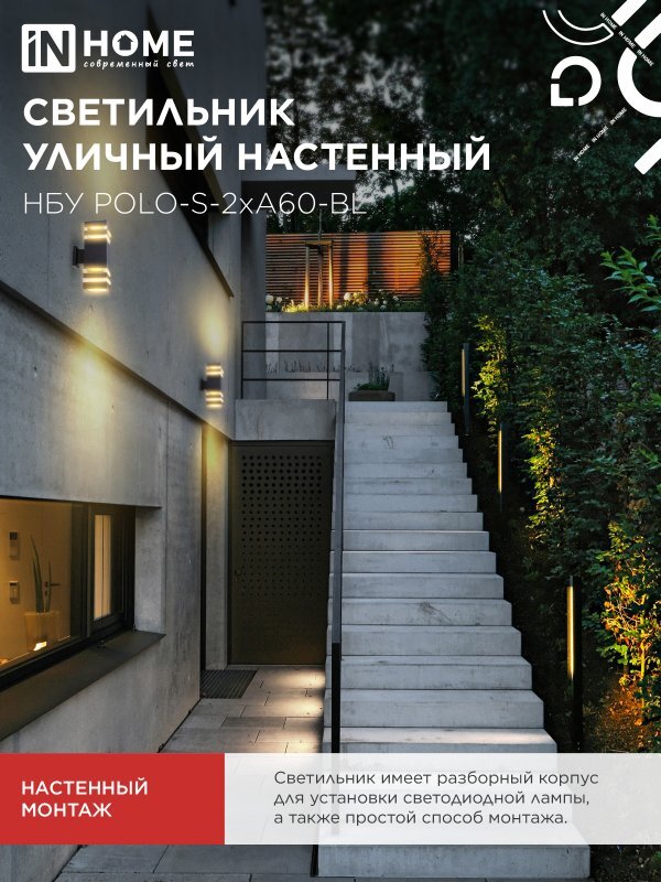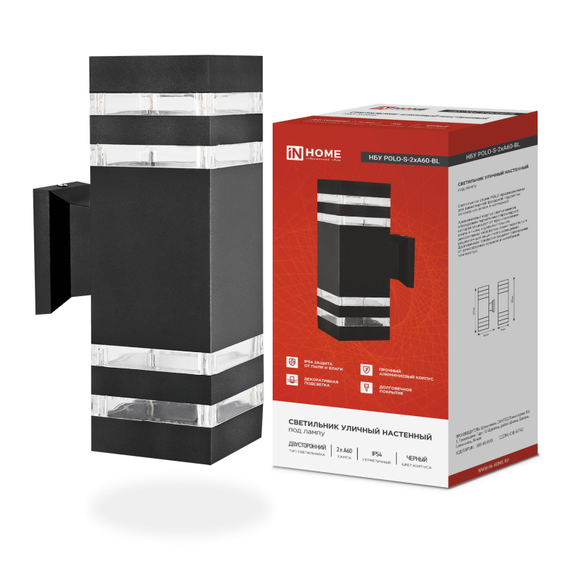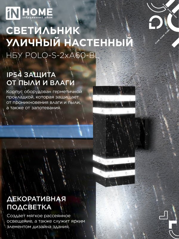 Светильник НБУ POLO-S-2хA60-BL E27 IP65 230В уличный настен. двусторон. под лампу 2хA60 алюм. черн. IN HOME 4690612037950