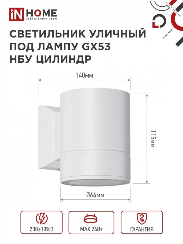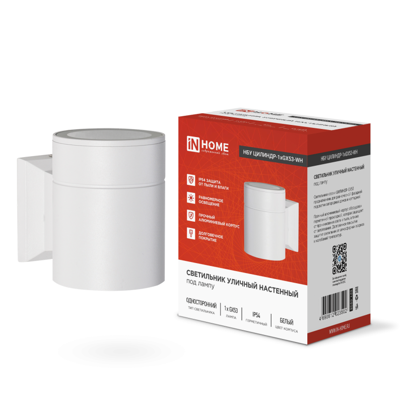 Светильник НБУ ЦИЛИНДР-1xGX53-WH 16Вт IP65 230В уличный настен. односторон. под лампу 1хGX53 алюм. бел. IN HOME 4690612023502