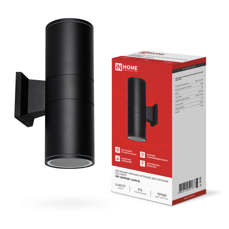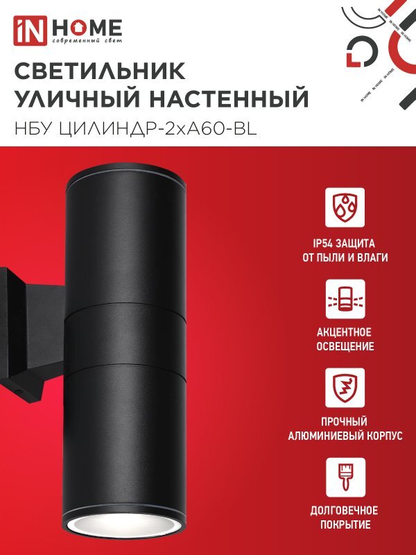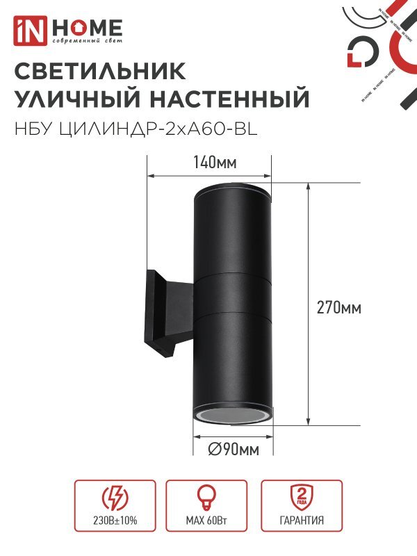 Светильник НБУ ЦИЛИНДР-2хA60-BL IP54 уличный настен. двусторон. алюм. черн. IN HOME 4690612059167