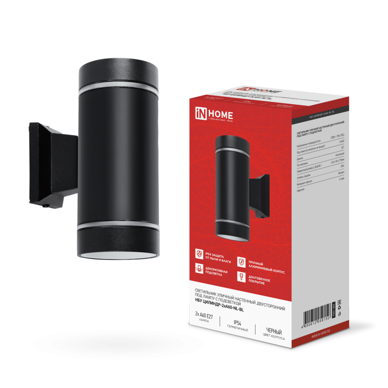 Светильник НБУ ЦИЛИНДР-2хA60-NL-BL IP54 уличный настен. двусторон. с подсветкой черн. IN HOME 4690612059150