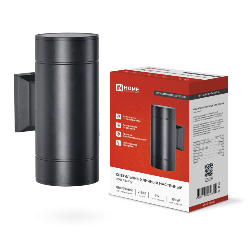 Светильник НБУ ЦИЛИНДР-2xGX53-BL 16Вт IP54 230В уличный настен. двусторон. под лампу 2хGX53 алюм. черн. IN HOME 4690612023533