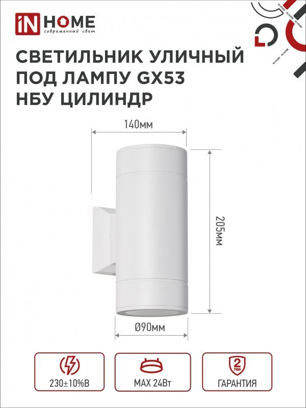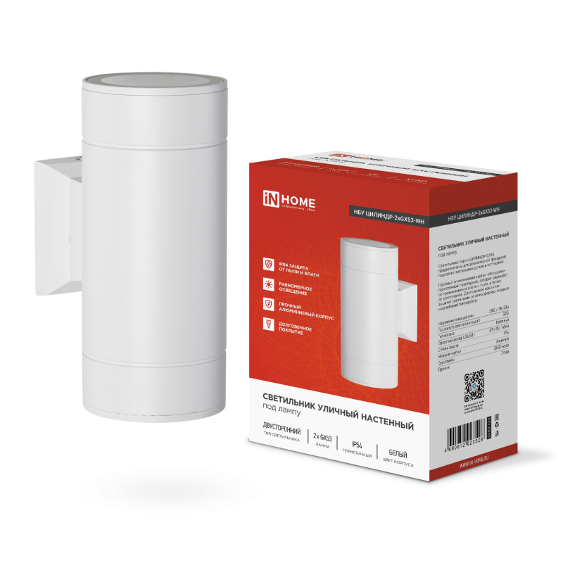 Светильник НБУ ЦИЛИНДР-2xGX53-WH 16Вт IP65 230В уличный настен. двусторон. под лампу 2хGX53 алюм. бел. IN HOME 4690612023526