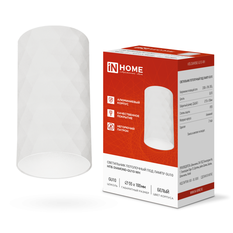 Светильник НПБ DIAMOND-GU10-WH 55х100мм потолочн. под лампу GU10 бел. IN HOME 4690612046471