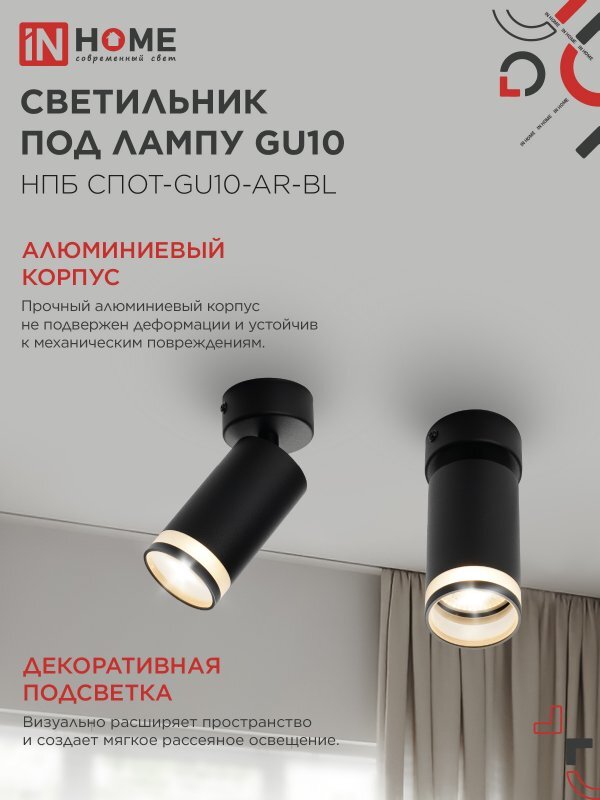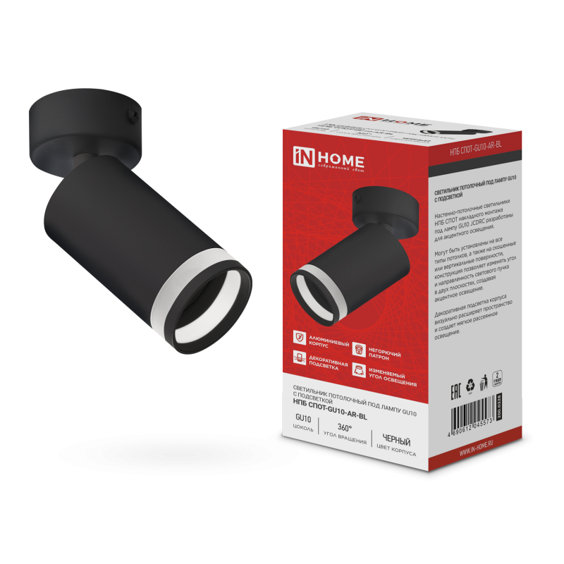 Светильник НПБ СПОТ-GU10-AR-BL 55х100мм потолочн. под лампу GU10 черн. IN HOME 4690612045573