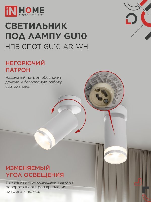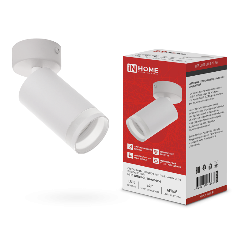 Светильник НПБ СПОТ-GU10-AR-WH 55х100мм потолочн. под лампу GU10 бел. IN HOME 4690612045566