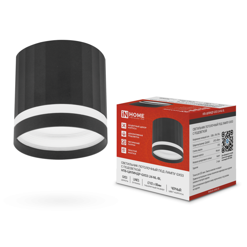 Светильник НПБ-ЦИЛИНДР-Gх53 LN-NL-BL 82х80мм потолочн. с подсветкой черн. IN HOME 4690612052182