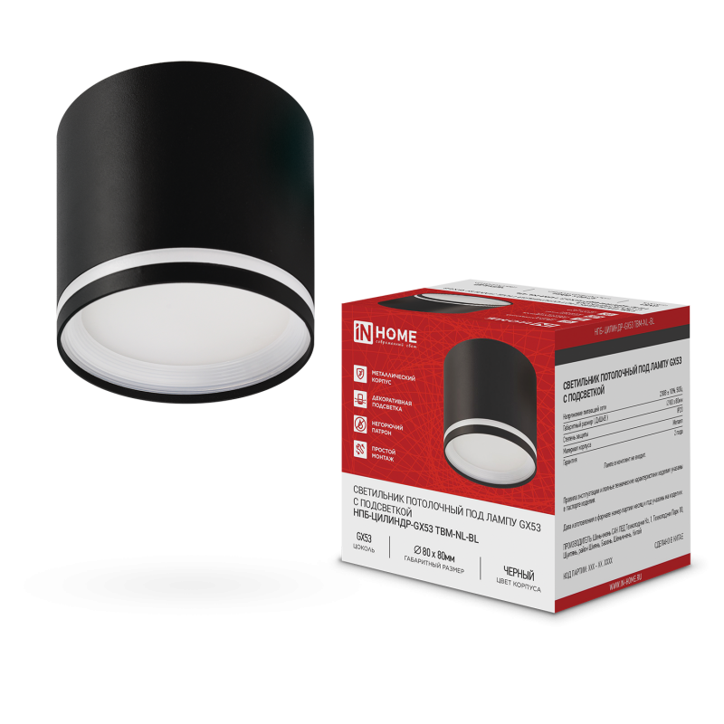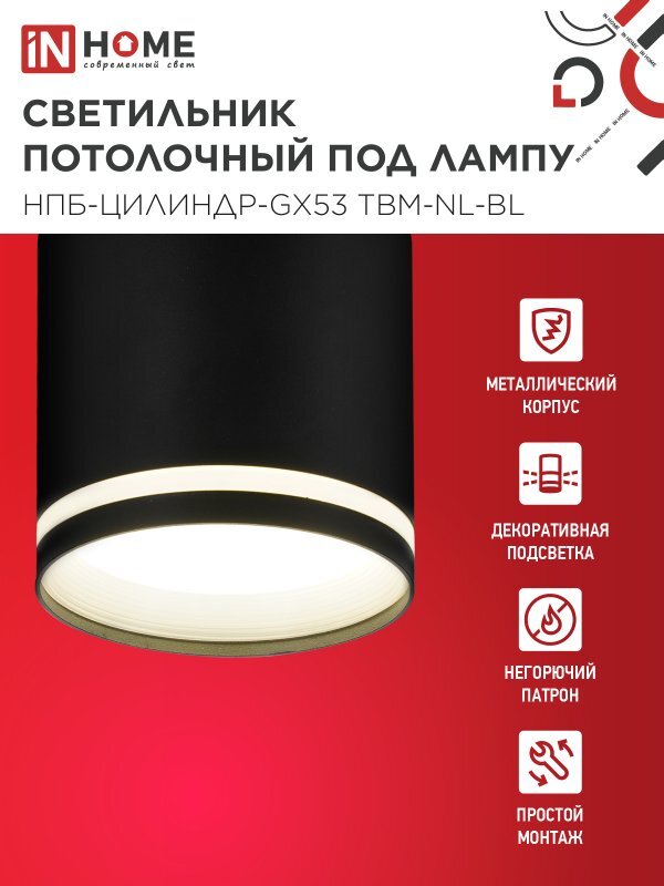 Светильник НПБ-ЦИЛИНДР-GХ53 TBM-NL-BL 80х80мм потолочн. с подсветкой черн. IN HOME 4690612059419