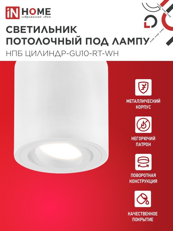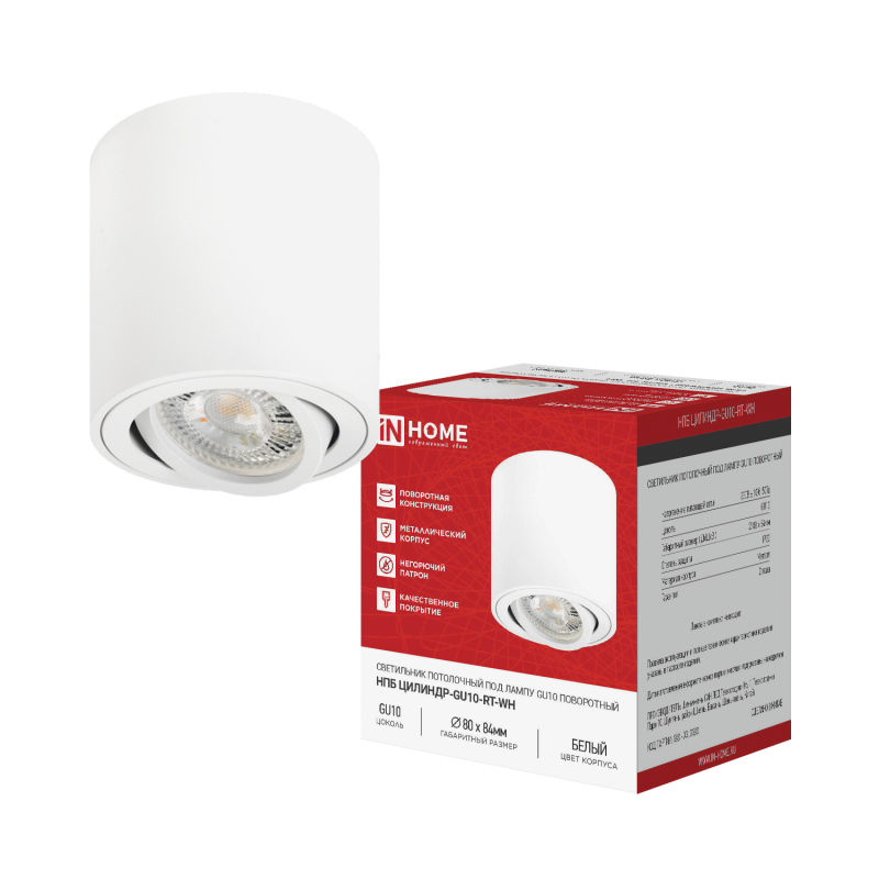 Светильник НПБ ЦИЛИНДР-GU10-RT-WH 80х84мм потолочн. поворотн. под лампу GU10 бел. IN HOME 4690612046600