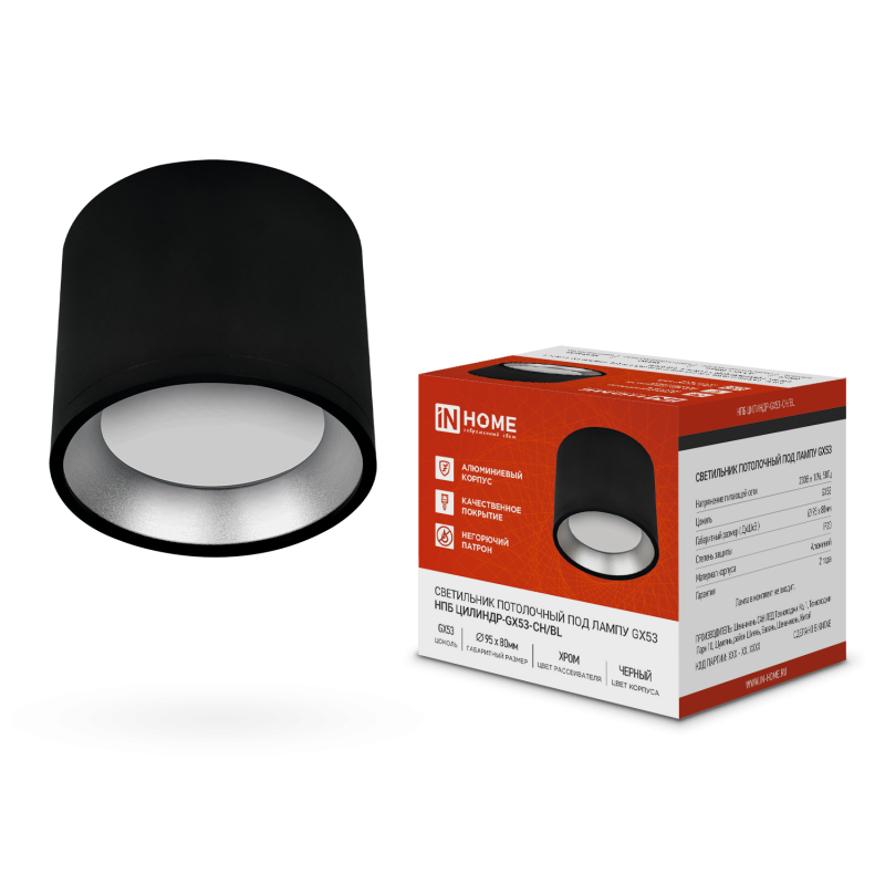 Светильник НПБ ЦИЛИНДР GX53-CH/BL 95х80мм потолочн. под лампу GX53 черн./хром IN HOME 4690612046570