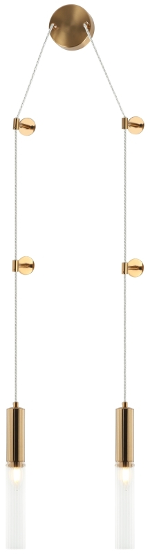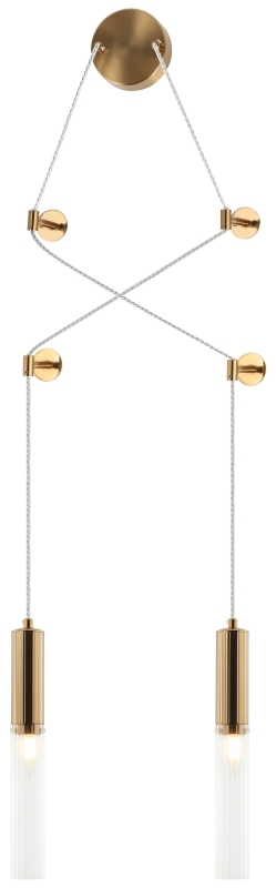 Светильник подвесной настенный из коллекции Satori выполнен из металла, гальванизированного в цвет бронзы, и декорирован вытянутыми прозрачными стеклянными плафонами с линейным декором. Провод на подвесах выполнен из перекрученного прозрачного шнура в винтажном стиле. Уникальность этих светильников заключается в том, что в зависимости от предпочтений их можно устанавливать как на потолок, так и на стену. Для крепления на стену в комплект добавляются дополнительные держатели. Данная серия идеально сочетается с сериеи? WUNDER.