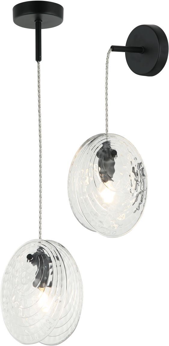 Светильник подвесной настенный коллекции Aura изготовлен из металла, окрашенного в черный цвет. Плафоны выполнены из высококачественного прозрачного стекла уникальной формы, напоминающей форму ракушки. Особенностью данной коллекции является возможность их установки как на потолок, так и на стену. Высокое качество и неповторимый дизайн светильника идеально подойдут как в классические, так и современные интерьеры. Из данной коллекции светильников можно сделать индивидуальный заказ любого цвета и размера.