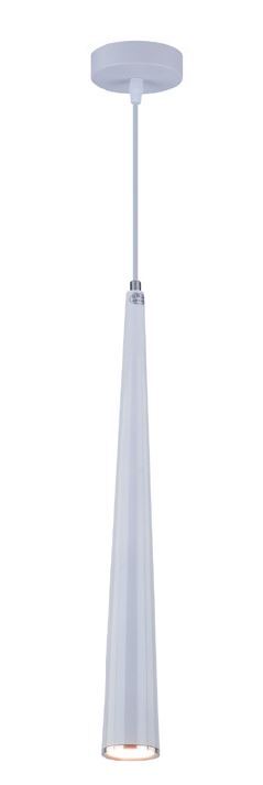 Светильник подвесной из коллекции Cone имеет металлическую потолочную чашу, окрашенную в белый цвет, и металлический конусовидный плафон, также окрашенный в белый цвет. Источник света закрыт белым матовым акрилом.