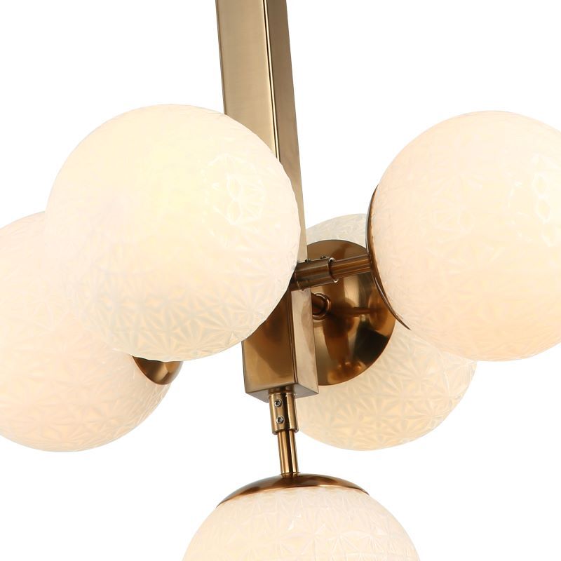 Светильник подвесной из коллекции Felis выполнен из металла, гальванизированного в цвет бронзы, и декорирован плафонами из фактурного белого матового стекла. Премиальное качество и неповторимыи? дизаи?н светильников идеально подои?дут в современные дизайнерские интерьеры.