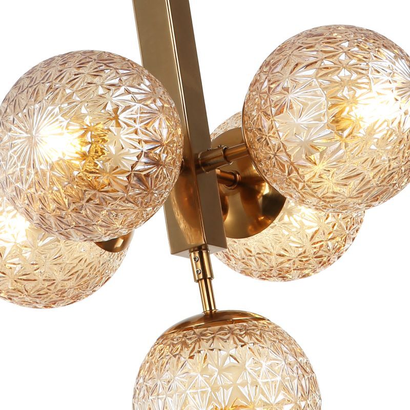 Светильник подвесной из коллекции Felis выполнен из металла, гальванизированного в цвет бронзы, и декорирован плафонами из фактурного стекла янтарного цвета. Премиальное качество и неповторимыи? дизаи?н светильников идеально подои?дут в современные дизайнерские интерьеры.
