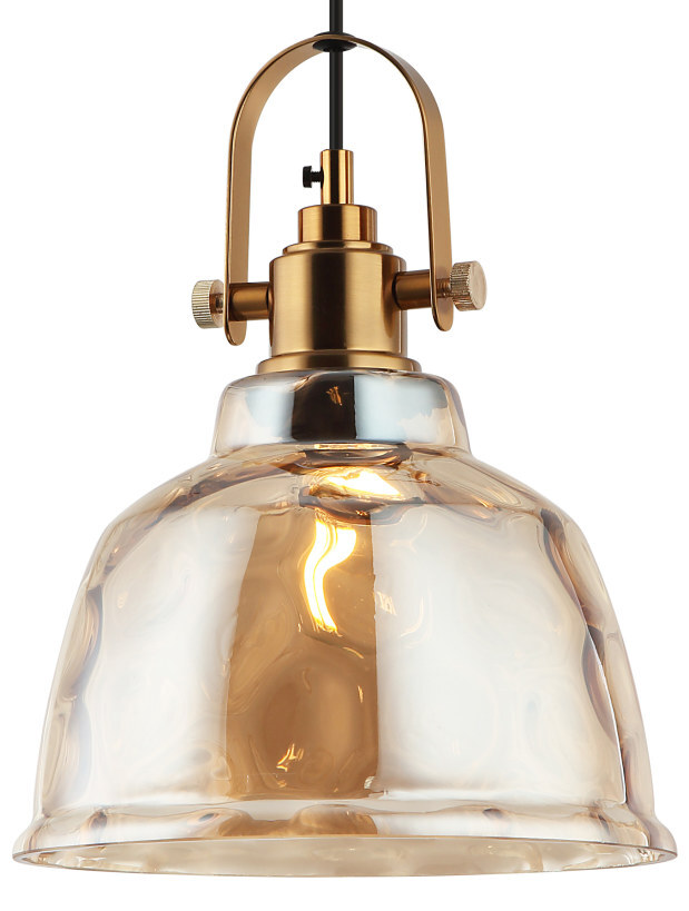 Светильник подвесной из коллекции Bell выполнен из металла, гальванизированного в цвет бронзы, и декорирован плафоном из оплавленного стекла цвета шампань. На подвесе дополнительно используется декоративный элемент в виде крупной металлической скобы, гальванизированной в цвет арматуры, что придает подвесу индустриальный вид. Премиальное качество и неповторимыи? дизаи?н светильников идеально подои?дут в современные и дизайнерские интерьеры.
