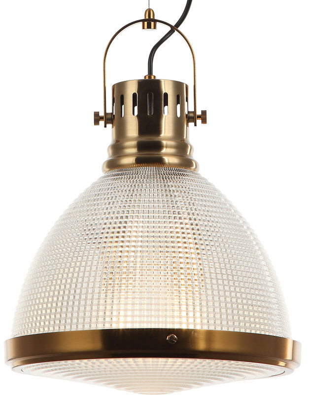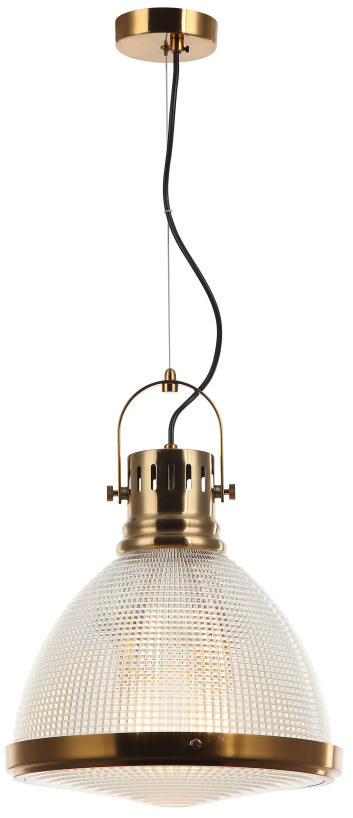 Светильник подвесной из коллекции Shiner выполнен из металла, гальванизированного в цвет бронзы, и декорирован плафоном из прозрачного фактурного стекла. Снизу источник света закрыт прозрачным текстурированным стеклом. На подвесе дополнительно используется декоративный элемент в виде крупной металлической скобы, гальванизированной в цвет арматуры, что придает подвесу индустриальный вид. Премиальное качество и неповторимыи? дизаи?н светильников идеально подои?дут в современные и дизайнерские интерьеры.