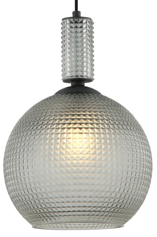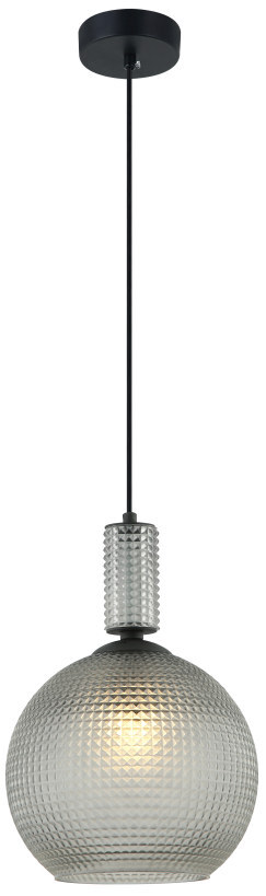 Светильник подвесной из коллекции Coloure выполнен из металла, окрашенного в черный цвет, и декорирован плафоном из фактурного стекла дымчатого цвета с эффектом крапления света.