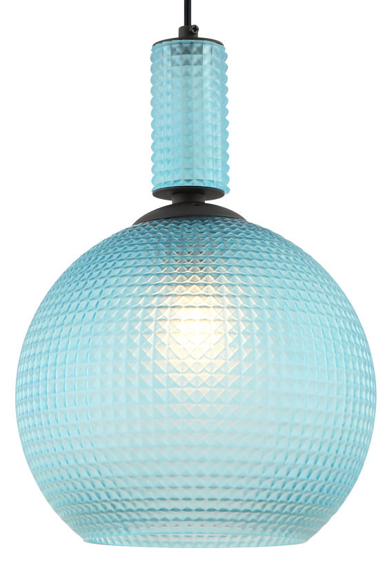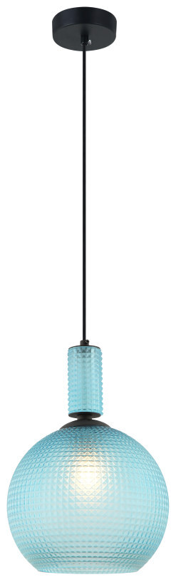 Светильник подвесной из коллекции Coloure выполнен из металла, окрашенного в черный цвет, и декорирован плафоном из фактурного стекла, окрашенного в бирюзовый цвет.