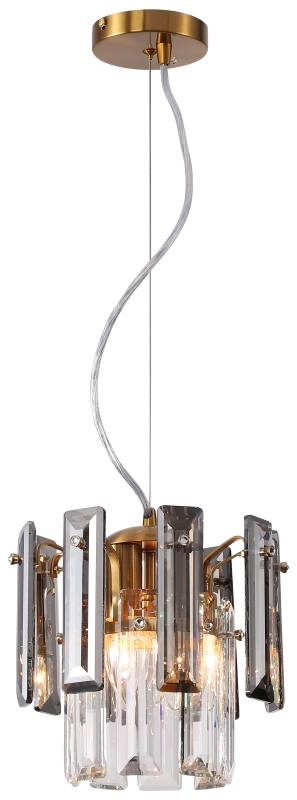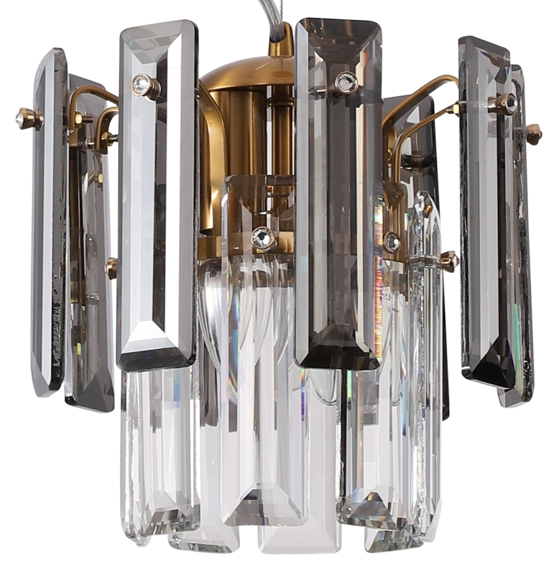 Светильник подвесной из коллекции Ton выполнен из металла, гальванизированного в цвет бронзы, и декорирован прозрачным и дымчатым хрусталем высшей категории прямоугольной формы. Подвес выглядит респектабельно и современно.