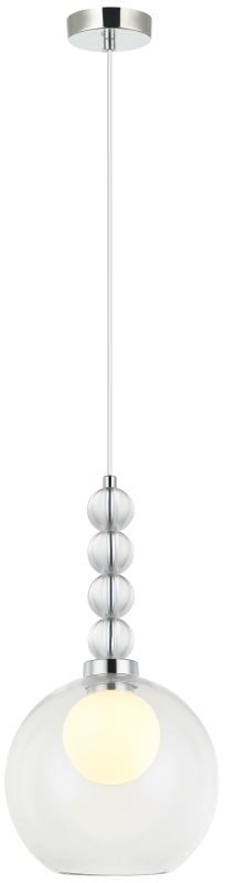 Светильник подвесной из коллекции Designo выполнен из металла, гальванизированного в цвет хрома, и декорирован прозрачными стеклянными сферами и плафоном из двух стекол: внутренним матовым и внешним прозрачным. Провод на подвесе выполнен из перекрученного прозрачного шнура в винтажном стиле.