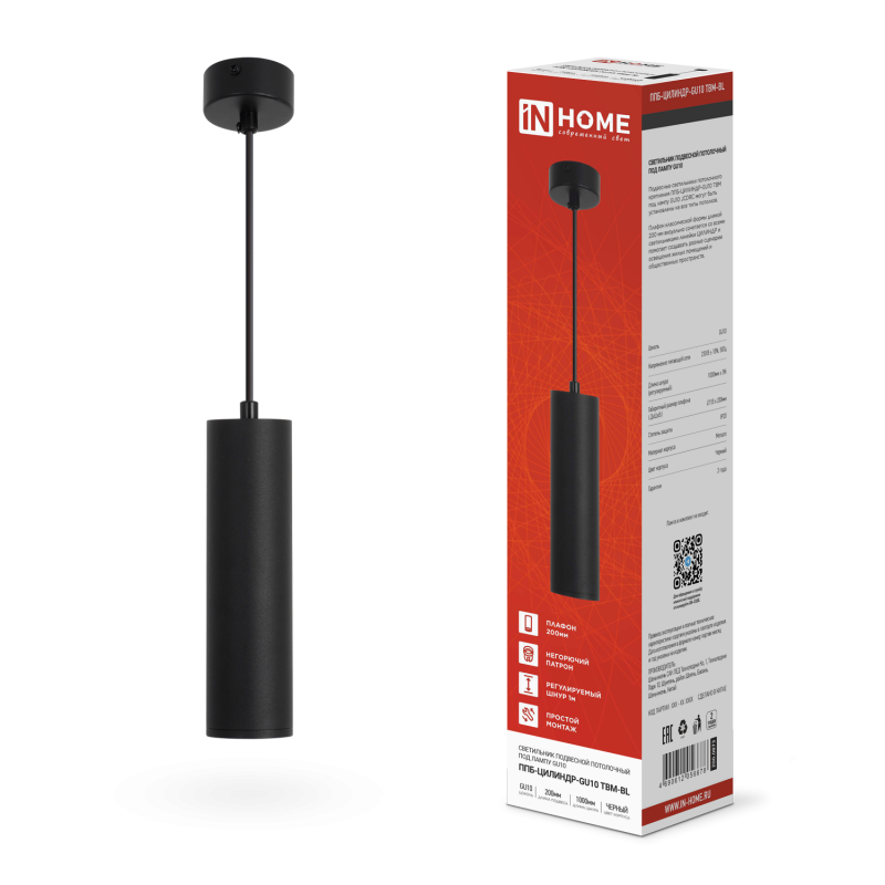 Светильник ППБ-ЦИЛИНДР-GU10 TBM-BL 200мм подвесной шнур 1м черн. IN HOME 4690612056678