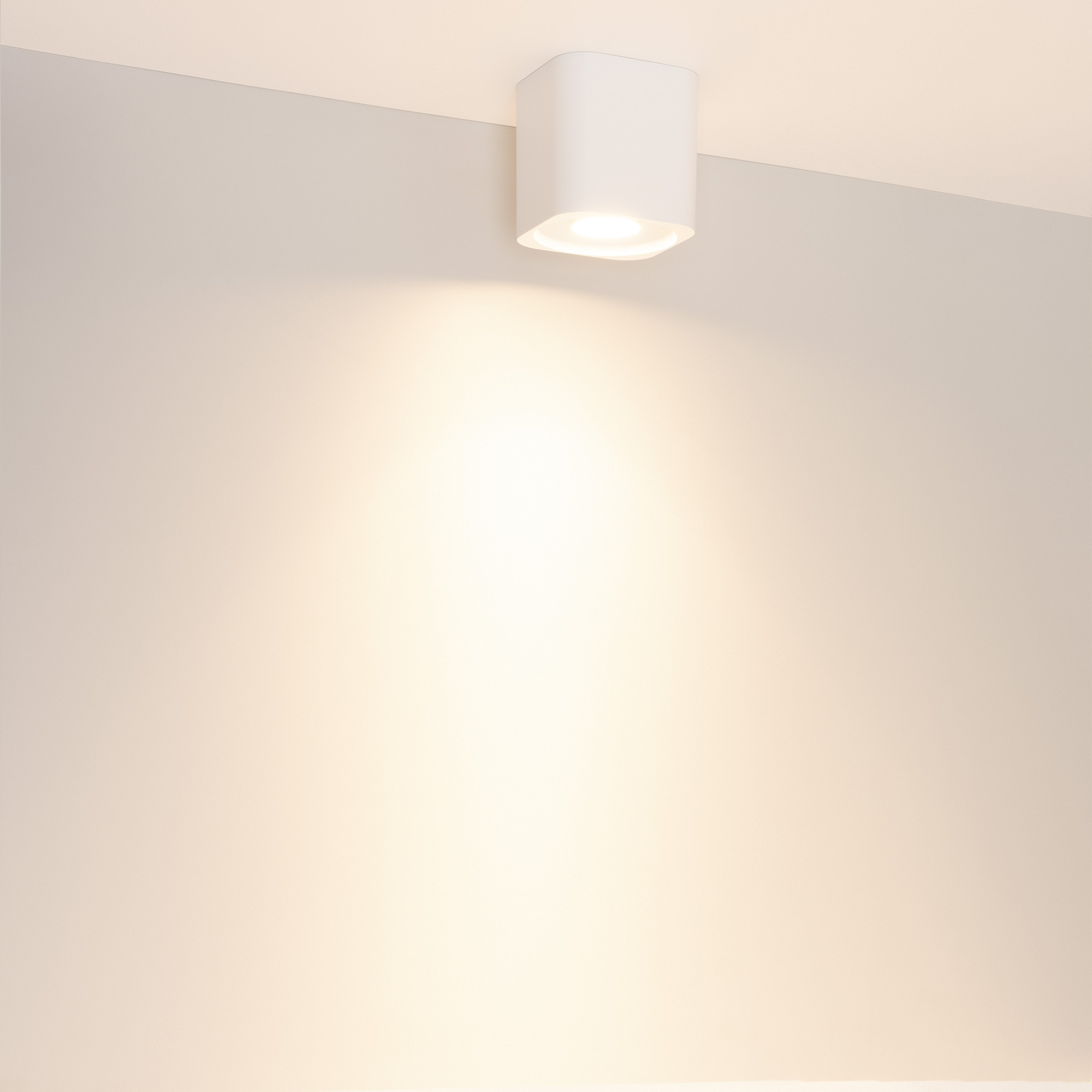 Накладной интерьерный светильник c регулируемым углом излучения. Мощность 10 Вт, св. поток 870-880 лм, 87 лм/Вт, тёплый 3000 K, CRI>90, угол 20°-45°, напряжение питания 230 В. Белый квадратный корпус, угол поворота светового модуля 60° (30°+30°), степень защиты IP20. Размер: длина 95 мм, ширина 95 мм, высота 98 мм. Монтаж накладной. Драйвер встроенный 27-48 В, 250 мА, пульсация < 0,3 %.