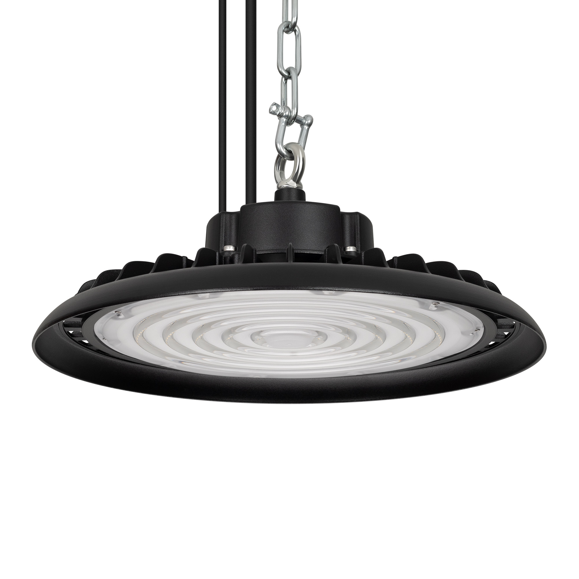 Светильник для освещения складских и промышленных помещений. Мощность 200W, напряжение питания AC 120-270V/50Hz. CRI 80. Тип светодиодов SMD2835, с групповой оптической линзой. Цвет свечения ДНЕВНОЙ 5000K, световой поток 30000 Lm, угол рассеивания 60°. Доступно управление по протоколу 0-10В. Цвет корпуса черный, линза из поликарбоната, степень влагозащиты IP65, ударопрочность IK08. Габариты Ф350xH140мм. Рым-болт в комплекте. Длина кабеля питания 900 мм, кабеля 0-10 200мм.