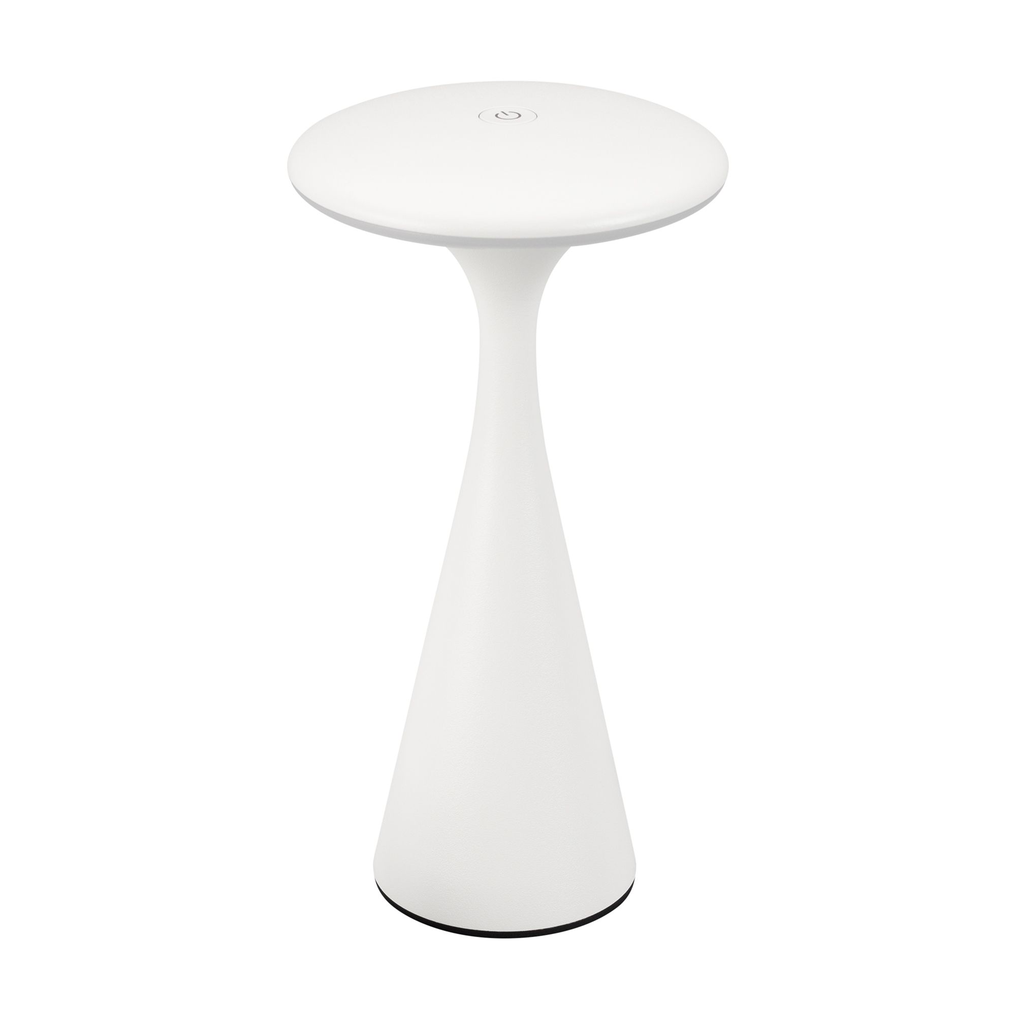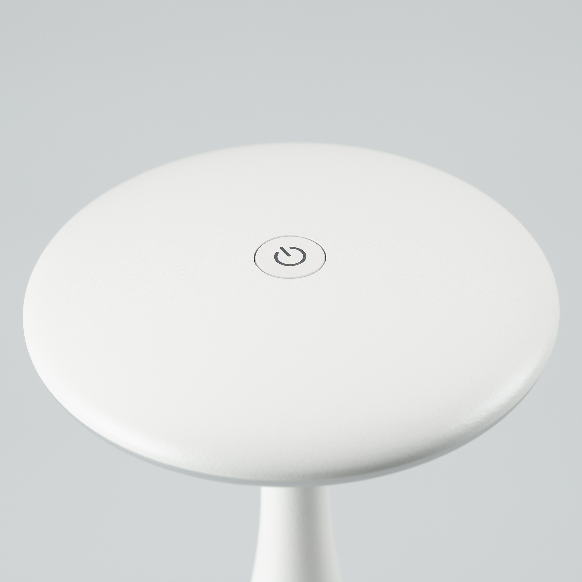 Настольный светильник со встроенным аккумулятором 1.5Вт, белый алюминиевый корпус. Цвет ТЕПЛЫЙ БЕЛЫЙ 2200-3000K, св.поток 110лм, CRI(Ra)>80, угол 123°. Размер Ф101x197мм. IP54. Зарядка от сети переменного тока AC220-240V. Тип встроенного аккумулятора 2600мАч Li-ion, напряжение батареи 3.7V